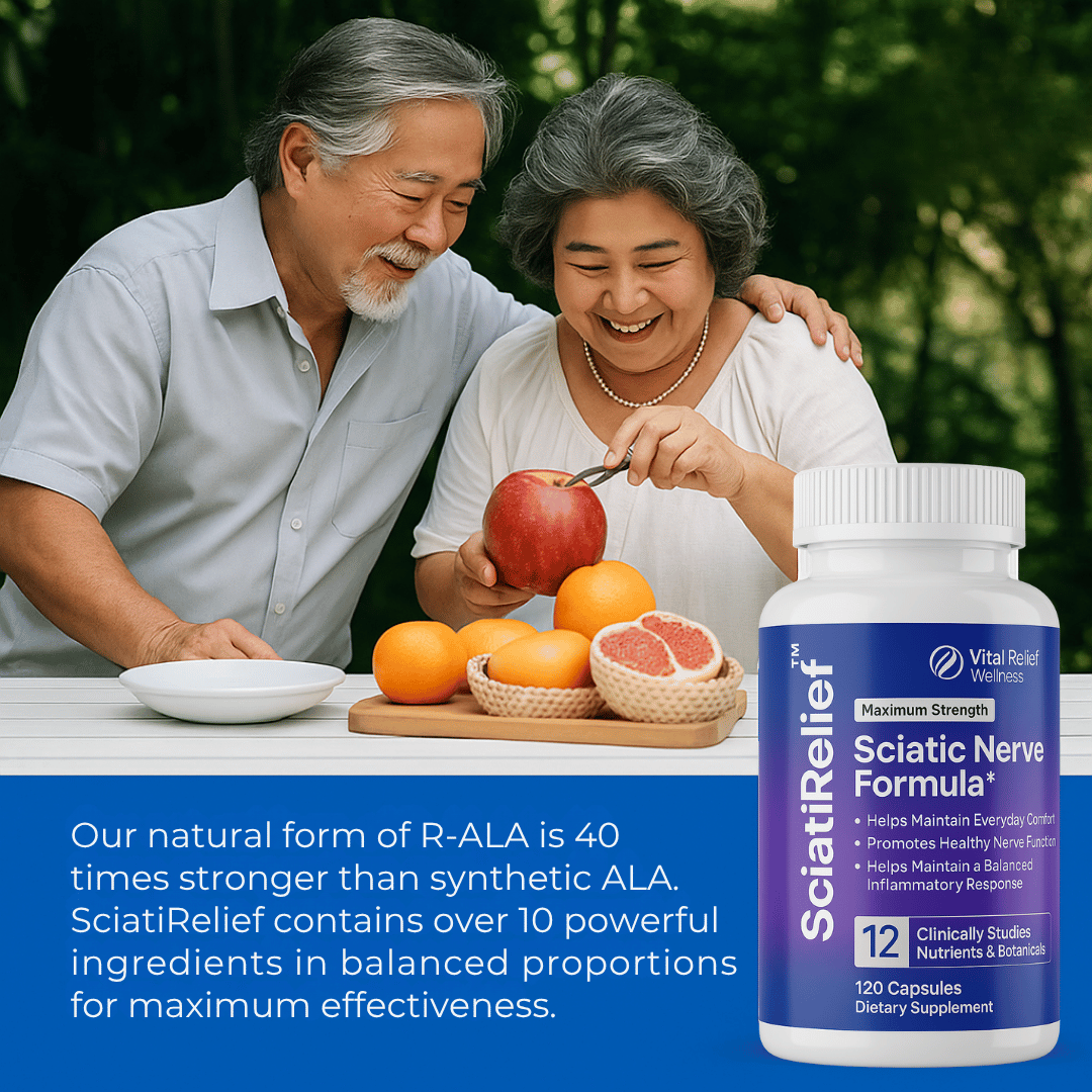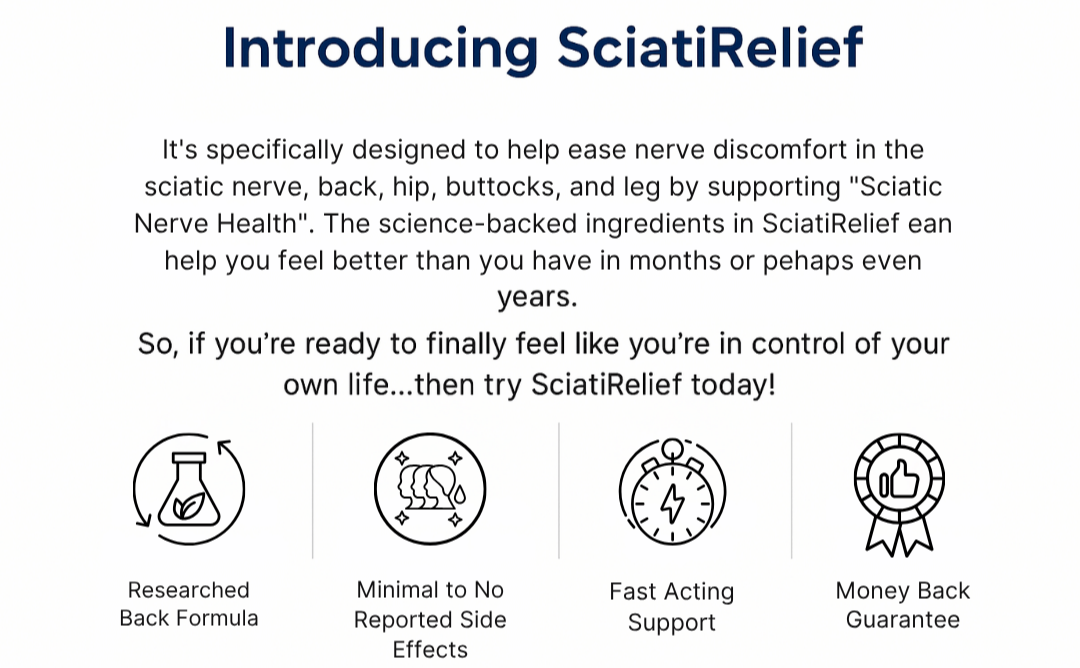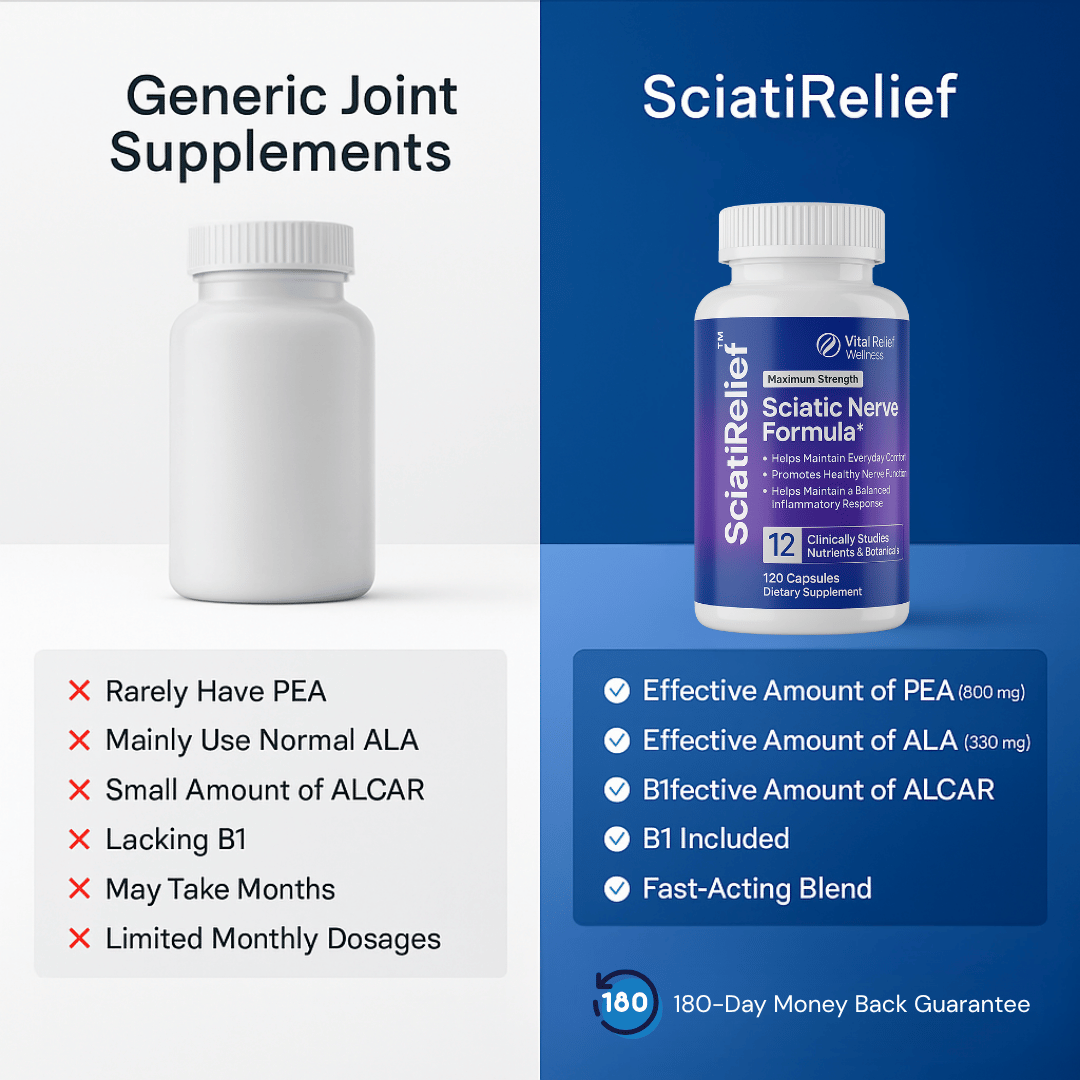 Unlike ordinary pain patches or creams that mask symptoms on the surface, SciatiRelief replenishes from within—addressing nerve health at its source. With age or wear-and-tear, critical nerve-supporting nutrients like Alpha Lipoic Acid slow down, making the sciatic nerve vulnerable to inflammation, discomfort, and tingling. SciatiEase delivers doctor-preferred, ultra‑absorbable Alpha Lipoic Acid plus a clinically studied nerve‑support blend, replenishing what your body needs to rebuild resilient nerve pathways over time. It’s not just temporary soothing—it’s deep-rooted support for real, lasting nerve function.